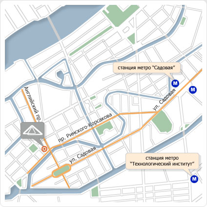Маршрутный автобус №1 или №19 от метро Садовая (выход на канал Грибоедова). Ехать до угла Английского и Римского-Корсакова. Бизнес центр "Аларчин мост"